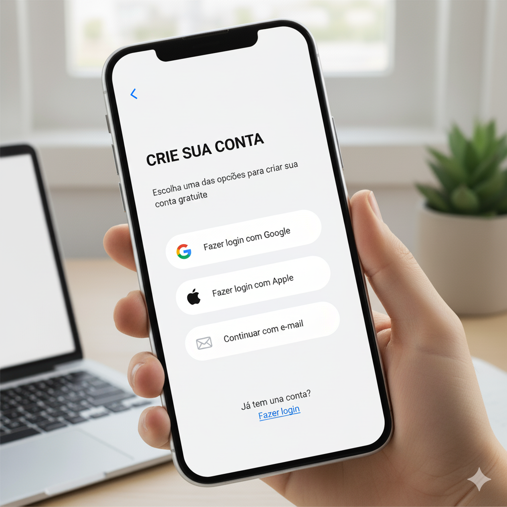 Após a validação, você será redirecionado para o site ou aplicativo do Perplexity para criar sua conta (caso ainda não tenha uma) ou fazer login. Escolha uma das opções de cadastro (e-mail, Google, Apple).